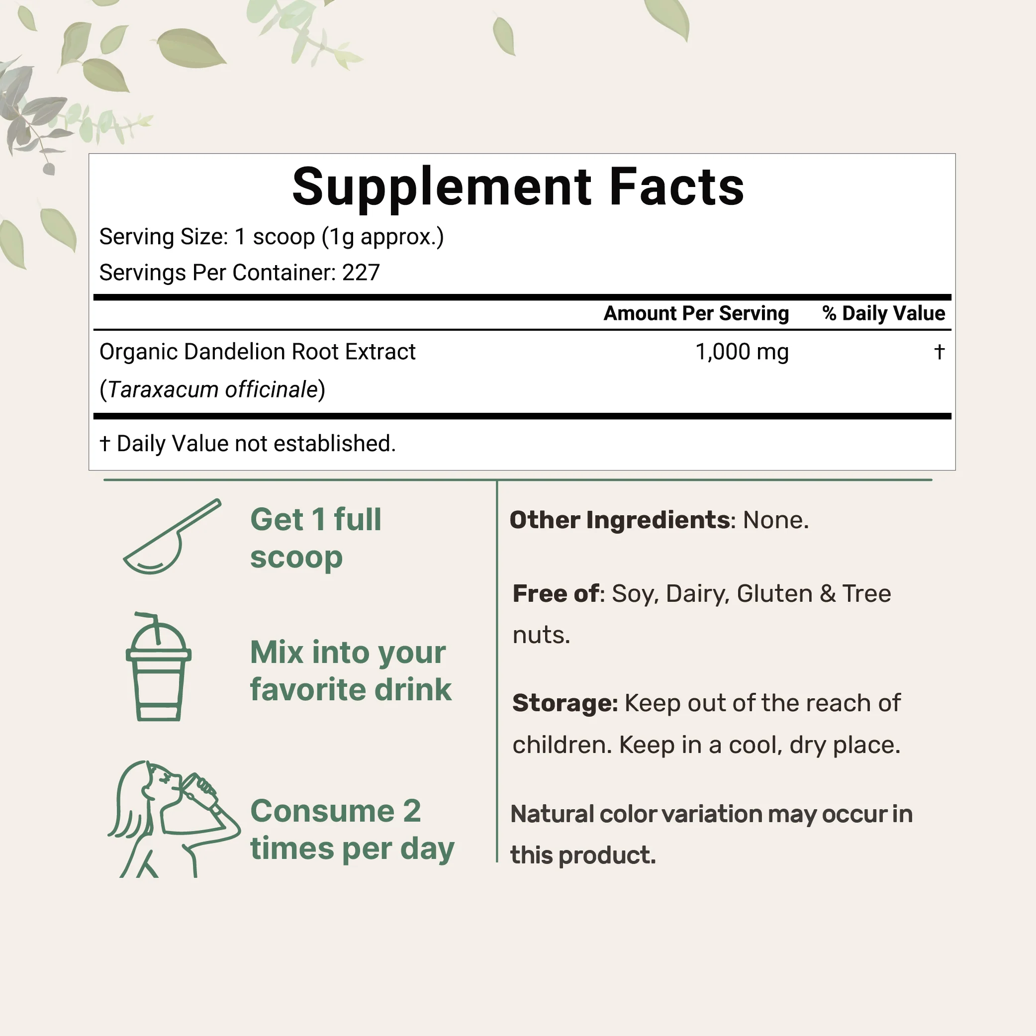 Each pouch contains 8 oz of pure organic dandelion root powder, providing a long-lasting supply of 227 servings.