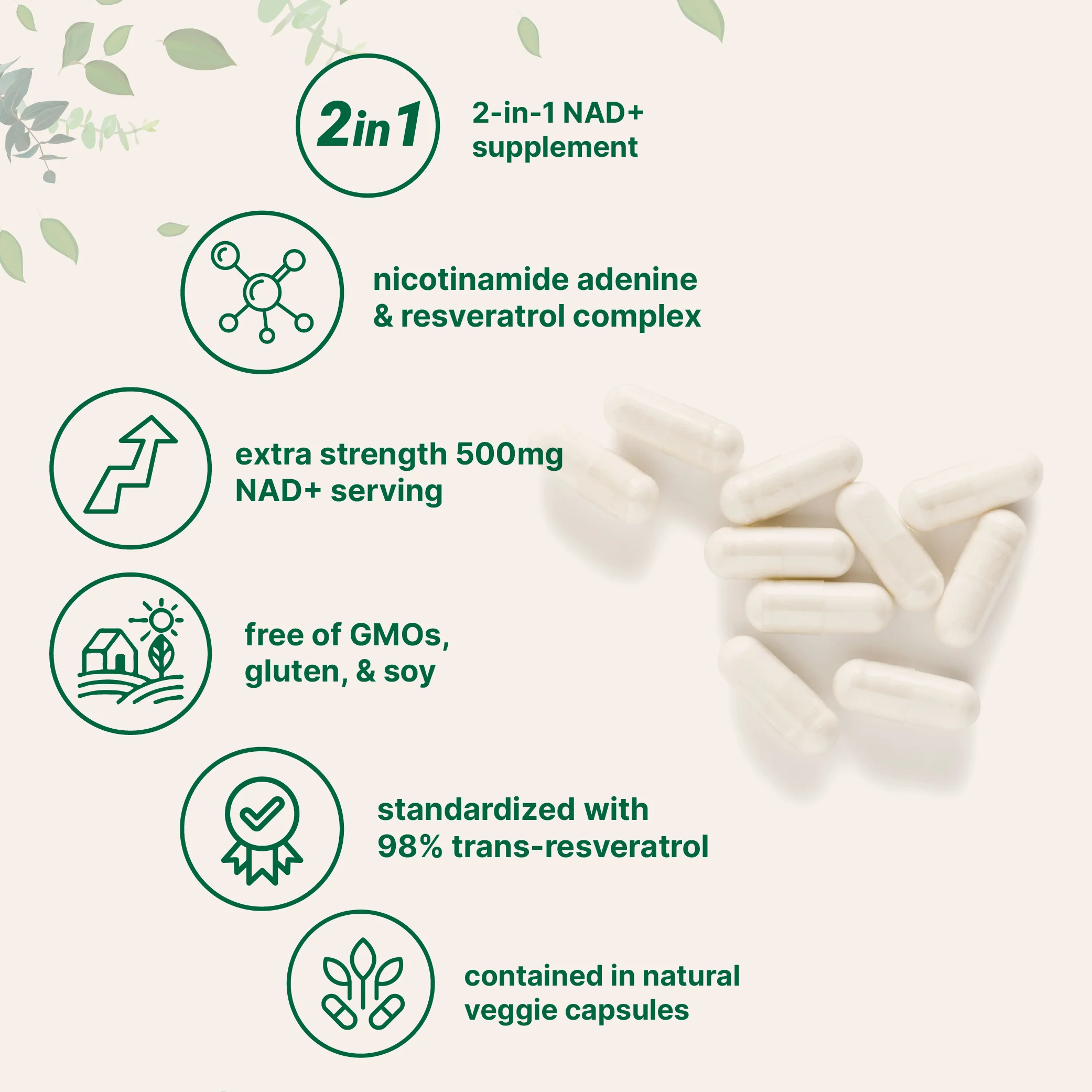 Micro Ingredients offers a 2-in-1 NAD+ formula in vegetarian capsules, combining 500mg NAD+ with plant-based resveratrol standardized to 98% trans-resveratrol in each serving.