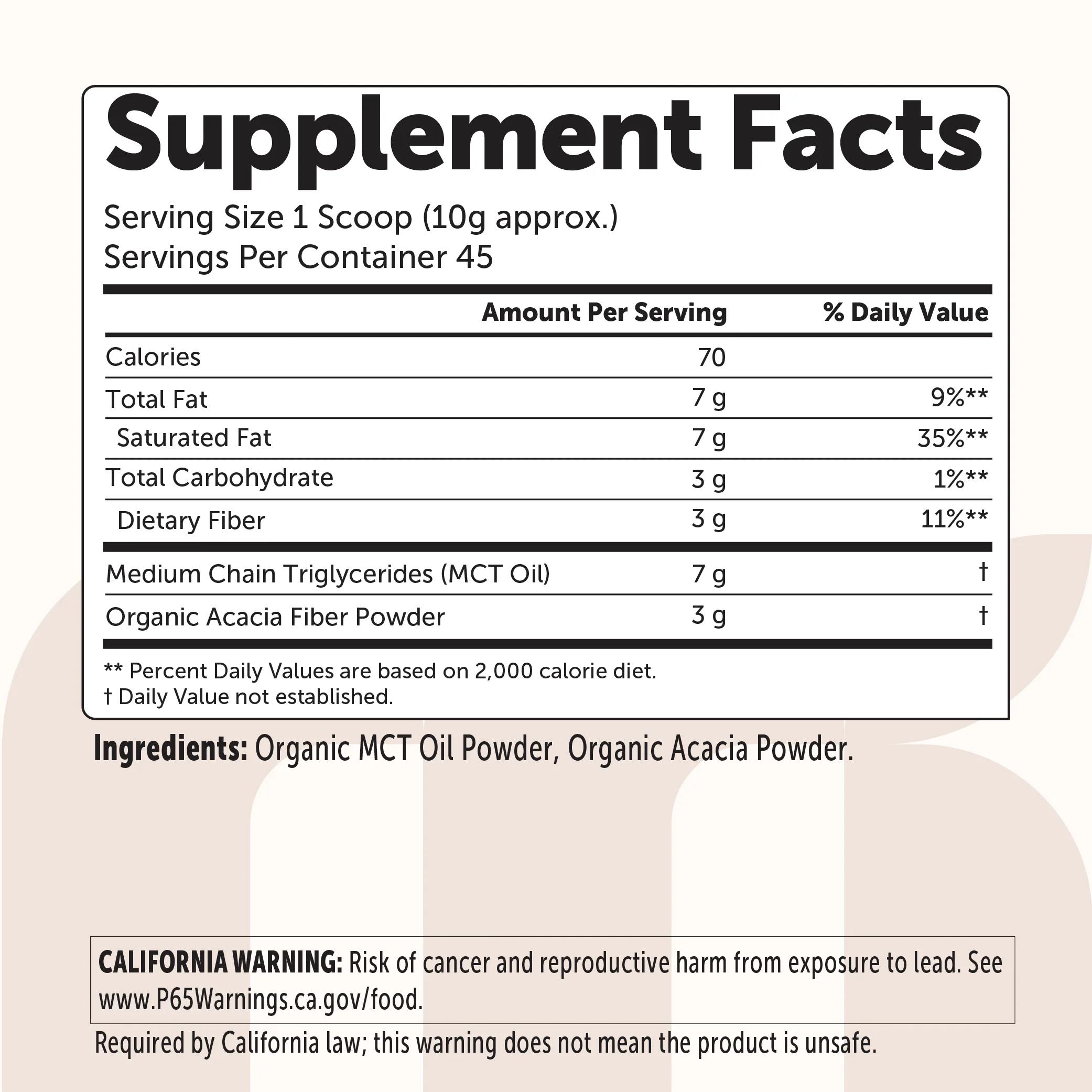 A clean, keto-friendly source of energy made from 100% organic coconuts. This high-performance MCT oil powder delivers a powerful 70% C8 (caprylic acid) and 30% C10 (capric acid) blend to support sustained energy, mental clarity, and metabolic performance.
